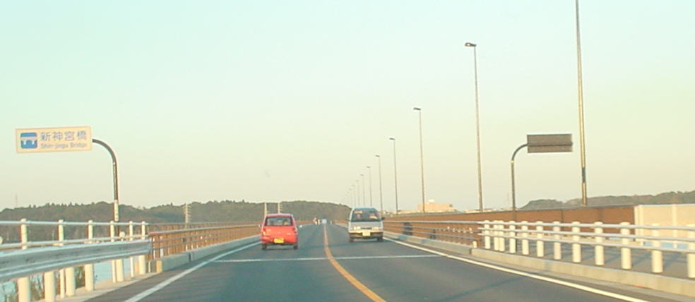 国道51号鹿嶋バイパスの「北浦」に架かる橋として平成14年4月25日に開通した。ここより南に架かる「神宮橋」は鹿嶋市街地を抜ける道になっていてしかも狭い事もあり 交通の流れも悪かったが,この「新神宮橋」開通で鹿嶋市街を迂回し 水戸〜東関東自動車道(潮来インター)〜成田・千葉の流れが円滑に また「神宮橋」一本であった鹿嶋・潮来間がより近くなり互いに結びつきが強くなるだろう。