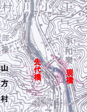 この道は今でもあるが,そうだとしたら もっと南の岩井橋で右岸に入り山方の宿町に入るのか?もしそうであればこの舟生橋は国道118号でなかった。岩井橋が:現在の舟生橋が出来る昭和48年まで国道118号であった可能性もある。
