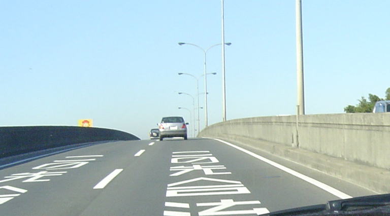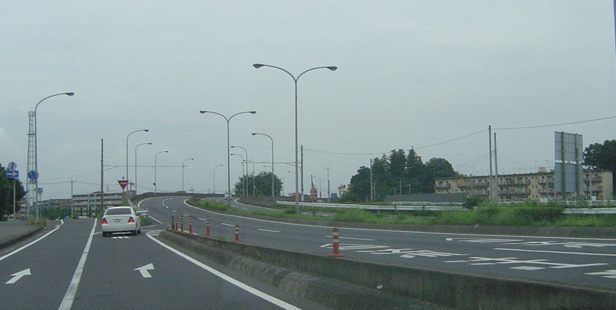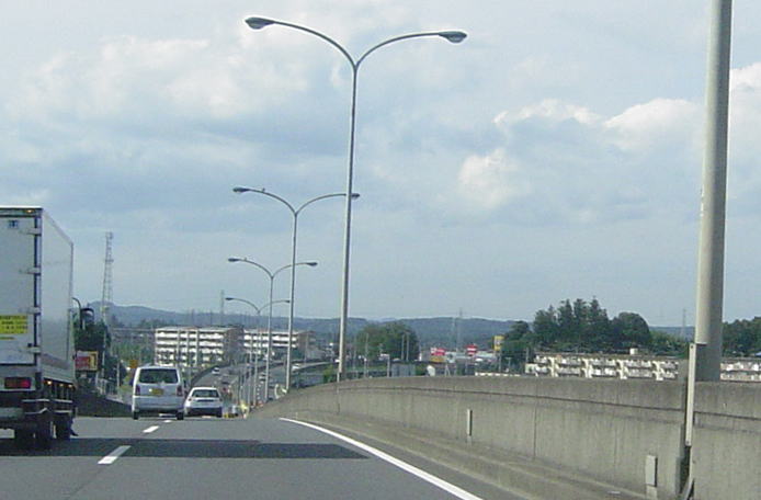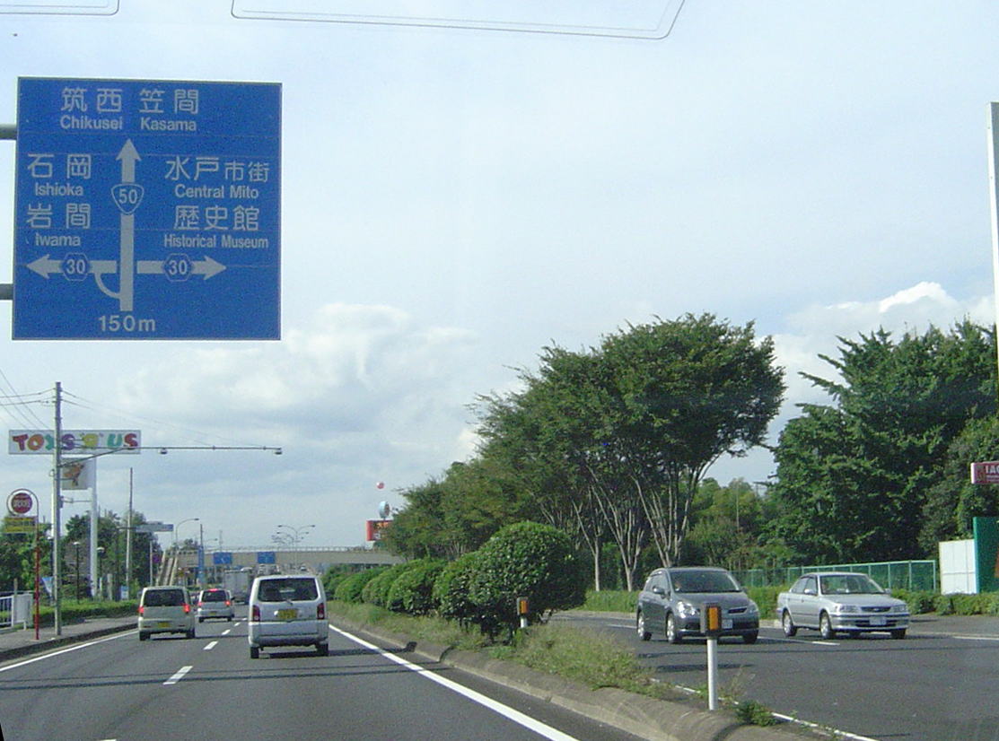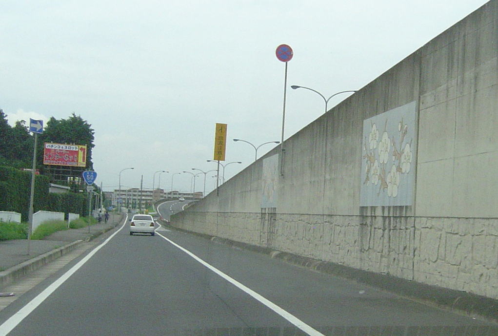 所謂 立体交差の高架橋である。横たうのは岩間街道(県道30号)という水戸市大工町から岩間町を結ぶ主要地方道。国道50号水戸バイパスが暫定2車線で全線(加倉井-酒門)開通したのは,昭和61年3月のこと。それから昭和62年7月全線4車線化と ここを含む3交差点の立体化を決定する。橋完成は平成元年となっているが,4車線供用は平成3年8月となっていて どちらかが後に作られたのではないか と思う。※橋の完成年元年というのは国土交通省から取り寄せた資料の誤植でした。
