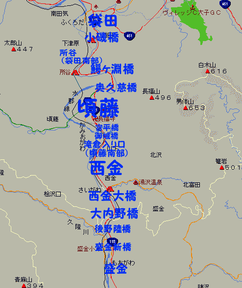 山方町118号の最北部の「盛金」から大子町袋田の区間。本格的に山間部に突入する。山の谷間を蛇行する久慈川に真っ直ぐな道にする為,バイパス化に伴って幾つもの橋が架けられている。