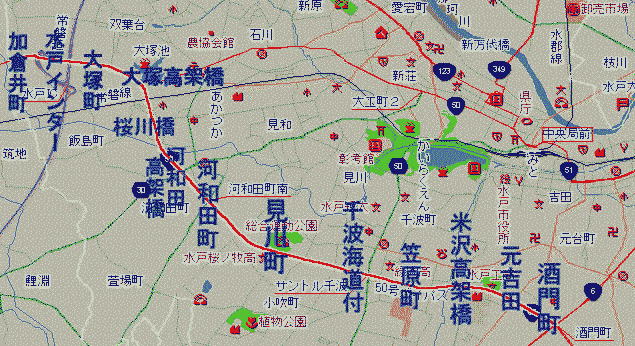 ここでは,国道50号水戸バイパス全域に加えて,それより西の市境界までの水戸市全域を景色を紹介する。50号バイパスより以西の1.7kmは昭和59年9月に拡幅工事が完了している。国道50号水戸バイパス(延長8.1km)は昭和57年8月に工事着手に至り,昭和59年3月に大塚町側から河和田町が部分開通。開通の翌日 常磐道水戸IC開通する。昭和60年の3月には河和田高架付近から米沢高架付近が開通。そして,昭和61年3月27日暫定2車線にて酒門町までの路線が全通。その翌年の昭和62年7月,50号バイパスの全線4車線化と3交差点(河和田高架橋・千波立体・米沢高架橋)を立体化計画を決定。続きは調査中。